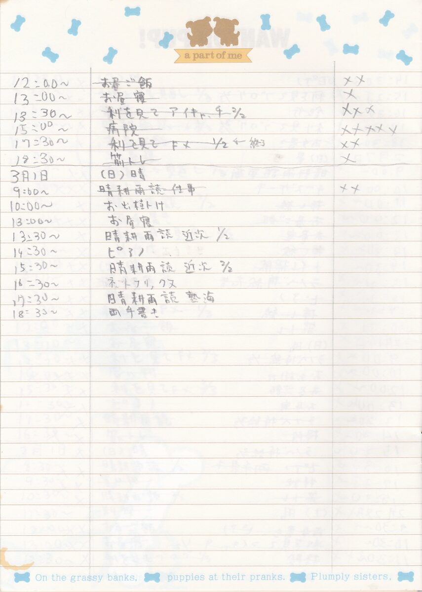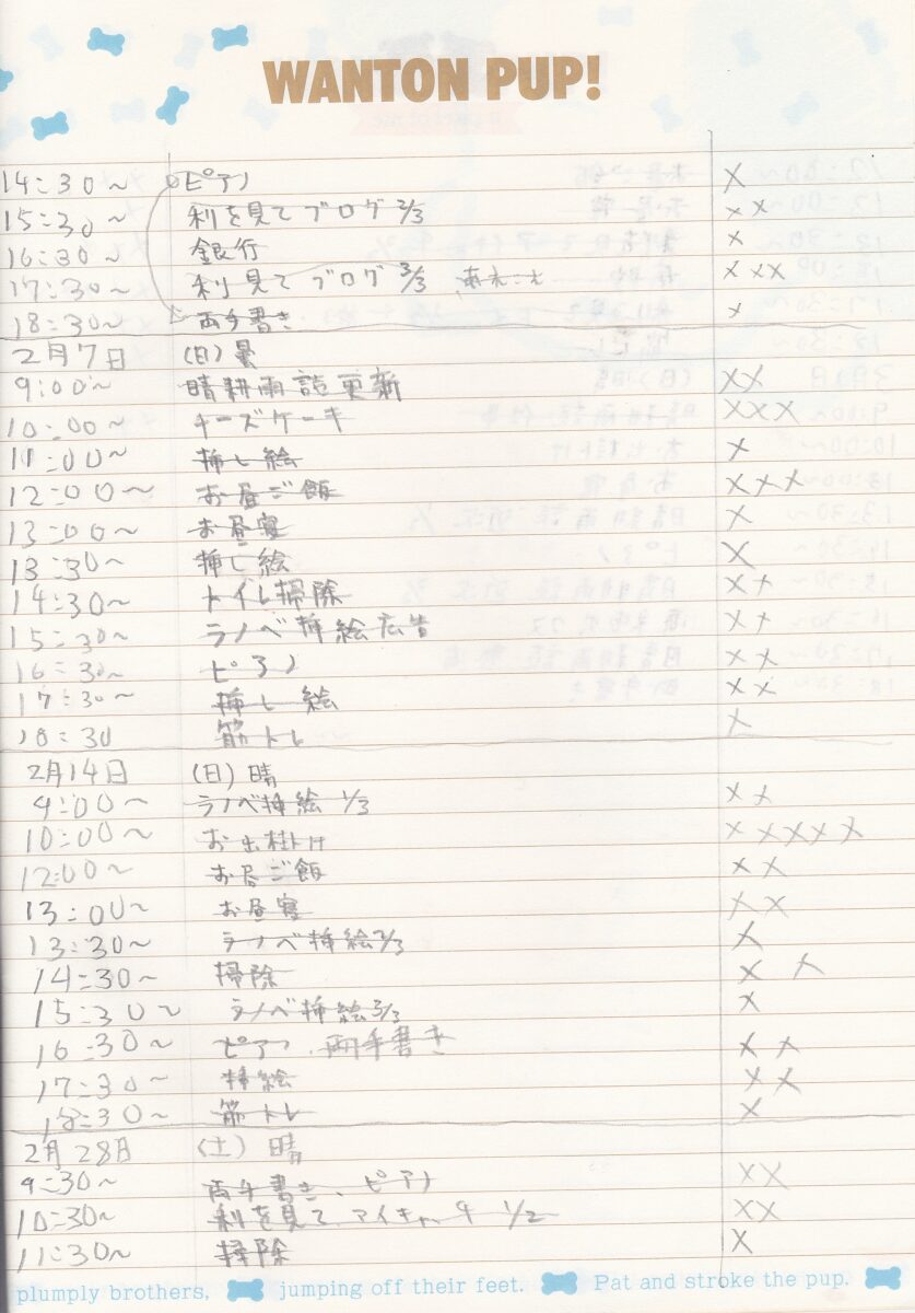 最近は帰宅⇒筋トレ⇒食事⇒両手書き⇒ブログ更新⇒小説⇒ピアノ⇒漢検⇒入浴⇒牛乳カルピス⇒毎日香⇒目のマッサージ⇒瞑想⇒歯磨き⇒就寝ってパターン。入浴後30分くらいで就寝。それにしてもなんでこんなにスケジュールぎっちり詰まってるの?